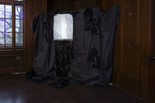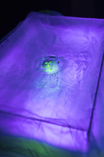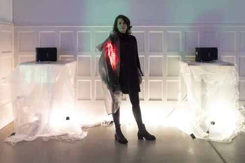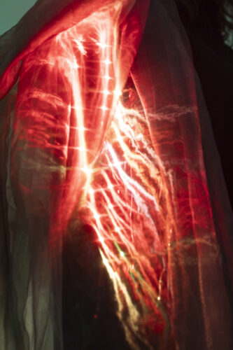 Layers of translucent fabric, interspersed with reactive light, respond to movement and proximity, while sounds – derived from recordings of electromagnetic fields in the MAIN laboratories – expand the work into a sonic dimension. Folding Field positions the body as a sensitive interface in an environment of energetic and informational exchange processes.