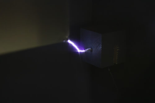 The work Adesse stages a confrontation between the viewer and an electrostatic sub-space. The viewer stands on an aluminium plate opposite a plate that pulsates with 50,000 volts of voltage. They become part of an invisible field. The field creates a presence that permeates the space and, subtly, the human body.