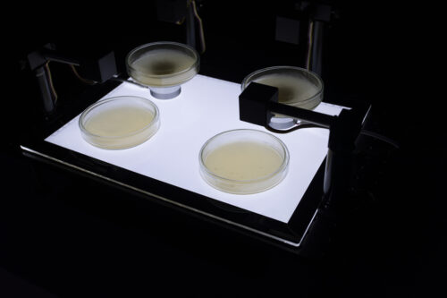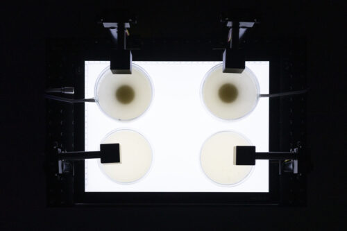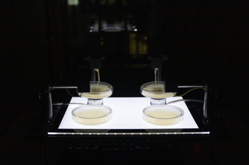 The turbidity of four yeast cultures is continuously monitored using sensors. Two of the cultures are exposed to sound frequencies that are modulated in real time by the measured parameters of all four cell cultures.